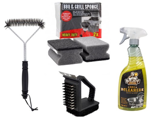 Zestaw rozmaitych akcesoriów do czyszczenie grilla. W naszym zestawie znajdują się: dwie szczotki do czyszczenia grilla, rusztu grilla, płyny do czyszczenia grilla, dwie gąbki do czyszczenia. Utrzymanie grilla w odpowiedniej czystości gwarantuje jego dłuższe i przyjemniejsze użytkowanie.