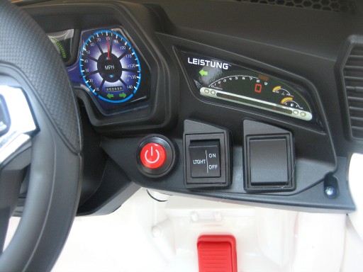 Kierownica w pojeździe posiada klakson oraz wesołe melodie. Naciskając przycisk uruchamiający pojazd usłyszymy dźwięk odpalania oraz pracy silnika.