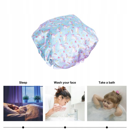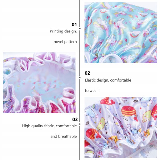 Jest on wykonany z satynowej tkaniny i materiałów PE i wygodne w noszeniu. Bądź wygodnie wokół głowy bez upadku. przyczynić się do zmniejszenia tarcia między włosami i poduszkę i chronić włosy swoich dzieci z wodą, dając im spania i kąpielowy czas i chronić swoje włosy łatwo.