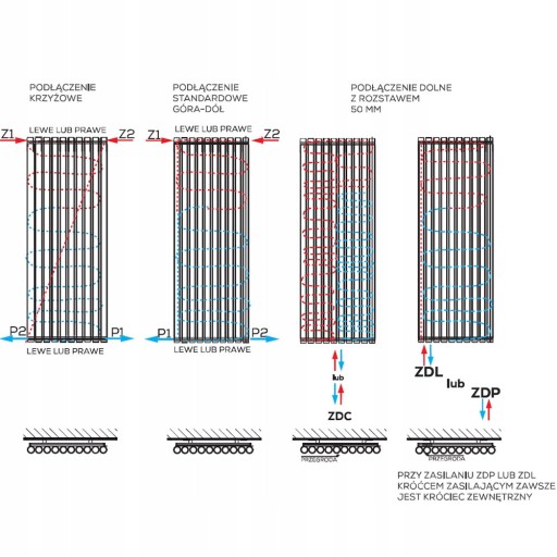 - -standardowym podłączeniem jest podłączenie boczne. Istnieje możliwość wykonania podłączenia od dołu z rozstawem 50 mm (zasilanie dolne centralne, prawe lub lewe)