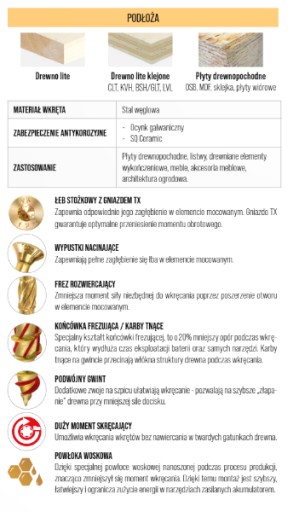Zaprojektowany we współpracy z wykonawcami nowy szpic wkrętów ciesielskich, ułatwia montaż oraz charakteryzuje się wysokimi parametrami wytrzymałościowymi takimi jak: wytrzymałość na wyrywanie, ścinanie itp. UP TO 8,8KN