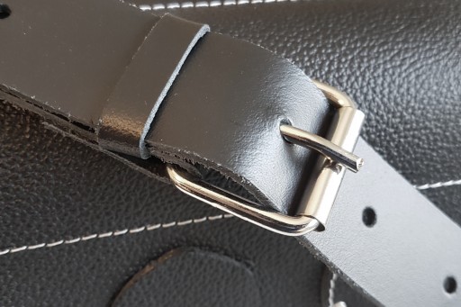 Pas nośny wykonany jest również ze skóry i przyszyty jest na stałe do bocznych ścianek. Długość pasa jest regulowana.