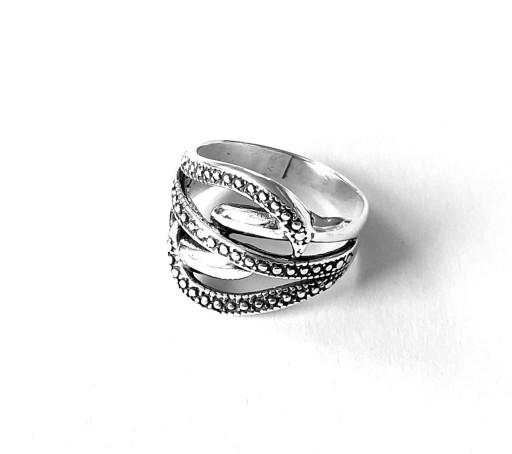 Bardzo efektowny srebrny pierścionek ze zdobieniami.