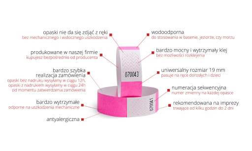 Opaski identyfikacyjne, bilety jednorazowego wstępu, idealne na każdą okazję, bardzo mocne, wytrzymałe, wodoodporne oraz antyalergiczne. Opaski są numerowane, samoprzylepne, posiadają swój własny bardzo wytrzymały klej, dzięki czemu nadają się również na kilkudniowe imprezy.