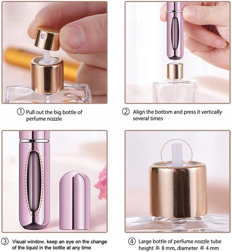 - Łatwy do napełnienia. Te podróżne pojemniki na perfumy wielokrotnego użytku mogą być używane do przechowywania olejków eterycznych, perfum, toników, wody różanej itp.