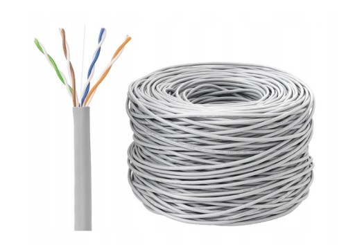 Kabel UTP w zestawie to wysokiej jakości skrętka komputerowa kategorii 5E, o czterech parach skręconych asymetrycznie żył