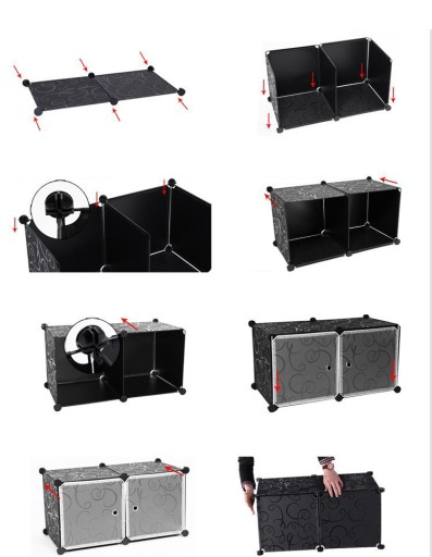 Szafa ma metalowy stelaż z łącznikami z tworzywa sztucznego. Jest bardzo prosta i szybka w montażu, a także w składaniu – składa się w klika minut. Sprawdzi się też w przypadku wyjazdów, lub gdy często zmieniamy miejsce zamieszkania. Półki posiadają magnesy w blokadach, dzięki czemu półeczki nie otwierają się same.