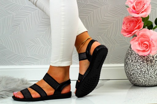 Damskie sandałki w kolorze czarnym na płaskim spodzie. Idealnie sprawdzą się jako obuwie na co dzień w letnie, upalne dni. Prosty fason dopasuje się również do eleganckich stylizacji. Elastyczny pasek przy kostce ułatwia zakładanie obuwia oraz dopasowanie go do stopy.