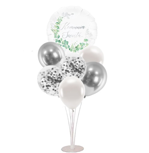 Zestaw balonowy składający się z dwóch rodzajów balonów. Na jednym balonie komunijnym, srebrna hostia otoczona jest wianuszkiem srebrnych listków. Na drugim, napis Komunia Święta otaczają gałązki eukaliptusa z zielonymi i srebrnymi listkami.