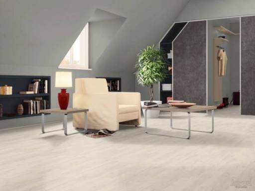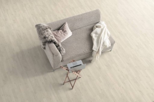 Dąb polarny to laminat w bardzo jasnym kolorze, imitujący drewnianą podłogę klepkową z pojedycznymi pęknięciami i sękami.