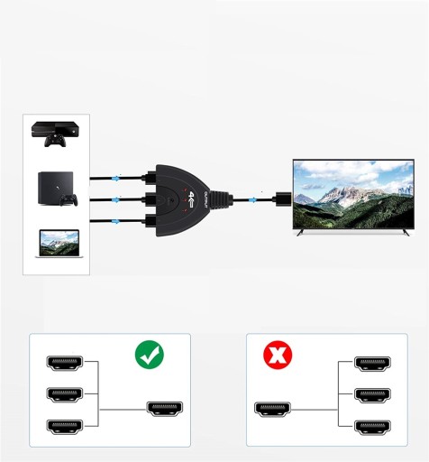 Ten przełącznik HDMI 2.0 umożliwia podłączenie maksymalnie czterech urządzeń źródłowych HDMI (takich jak odtwarzacz DVD, dekoder DVBT, konsola do gier, Apple TV, komputer lub Blueray) do jednego portu wejściowego HDMI w telewizorze HD, projektorze lub monitorze. Można go użyć do rozszerzenia liczby portów HDMI na dowolnych urządzeniach HDMI. Obsługuje UHD 4K przy 60 Hz HDCP 2.2 RGB 4:4:4. Jego przepustowość wzmacniacza wideo może wynosić do 18 Gbps/600MHz.