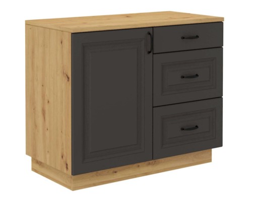 składa się z części jednorzwiowej oraz trzech szuflad. Wewnątrz za drzwiami znajduję się jedna półka. Kolekcja Flawia GRAR to stylowe meble przeznaczone do aranżacji pokoju dziennego, jadalni, sypialni. Meble zostały wykonane z wysokiej jakości płyty meblowej laminowanej, korpusy w dekorze dębu artisan i fronty w kolorze grafitowym z płyty MDF. Charakterystyczną cechą kolekcji są frezy jak i czarne uchwyty na frontach.