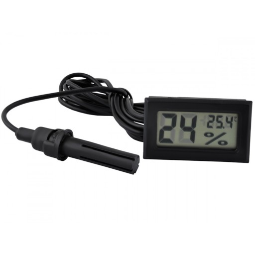 Elektroniczny higrometr z termometrem z dużym wyświetlaczem LCD i sondą na długim kablu. Urządzenie charakteryzuje się dobrą rozdzielczością pomiaru i szybkością reakcji. Wystarczy położyć je na otwartej dłoni i niemal od razu widać reakcję przyrządu.