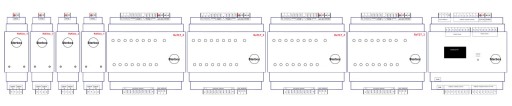 Do sterowania obwodami 230V ( żarówki, rolety, żaluzje, zawory, bramy garażowe, wjazdowe itp) wymagane jest podłączenie zewnętrznych przekaźników. Do sterownika należy zastosować zasilacz 12v o mocy odpowiedniej do ilości podłączonych modułów oraz przekaźników