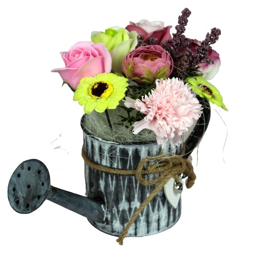 Bukiet wykonany w metalowej konewce, z wysokiej jakości kwiatów mydlanych i dodatków sztucznych.