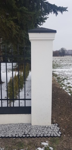 Dzięki temu że elementy, czyli słupy i murki dolne są jednorodną bryłą, montaż jest bardzo szybki i nikomu nie powinien sprawić problemu, w porównaniu np. z elementami modułowymi, gdzie każdy element należy oddzielnie zalewać i spoinować. Wystarczy jedynie wylać miejscowe stopy . Na tych że stopach ustawiamy słupy i murki, zalewając jedynie środek słupka, łączenia należy zasylikonować uszczelniaczem dekarskim, a daszki przykleić na klej mrozoodporny