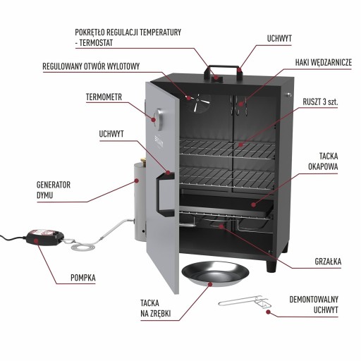 - Kompletny zestaw - wszystko czego potrzebujesz do procesu wędzenia znajdziesz w zestawie: wędzarnia elektryczna z pełnym wyposażeniem, generator dymu oraz próbka zrębków wędzarniczych.