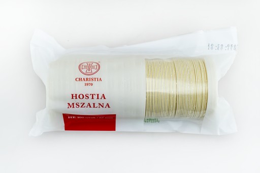 Hostia mszalna o średnicy 67 mm, z obustronnym znakiem krzyża, z zamkniętymi krawędziami zewnętrznymi.