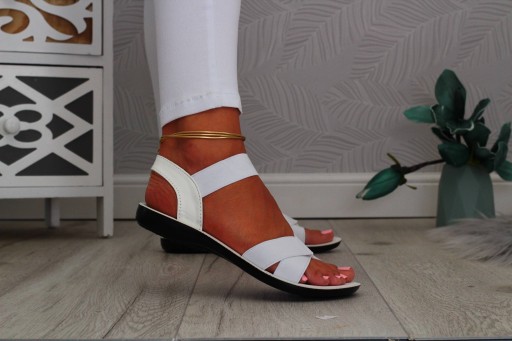 Damskie sandałki w kolorze białym na płaskiej podeszwie. Idealnie sprawdzą się jako obuwie na co dzień w letnie, upalne dni. Prosty fason dopasuje się również do eleganckich stylizacji. Elastyczny pasek przy kostce ułatwia zakładanie obuwia i ułatwia jego dopasowanie do stopy.
