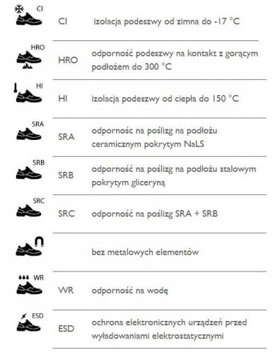 - Norma: EN ISO 20347:2012 O1 FO SRC, ESD według EN IEC 61340-4-3:2018