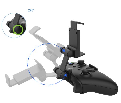 Mocowanie na telefon można odchylać do przodu / do tyłu w zakresie 180 stopni. Pozwala to na idealne ustawienie telefonu względem Pada.