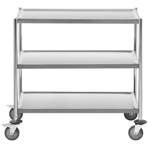 Solidny wózek kelnerski marki Royal Catering, eksperta w dziedzinie wysokiej jakości mebli ze stali nierdzewnej, z trzema solidnymi półkami jest idealny do stosowania w stołówkach, dużych kuchniach, restauracjach, obiektach użyteczności publicznej lub w przestrzeniach prywatnych. Możesz go używać do serwowania dużych ilości jedzenia i napojów za jednym razem lub do transportu brudnych naczyń z powrotem do kuchni.