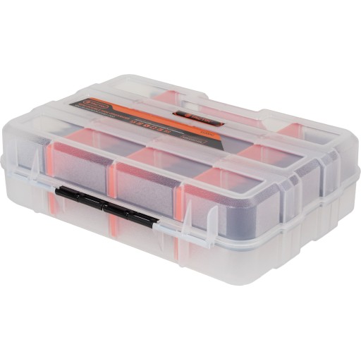 Organizer dwustronny 320042 marki Tactix to niewielki ale zaskakująco pojemny i poręczny pojemnik do przechowywania różnego rodzaju drobnych akcesoriów. Wykonany z czystego tworzywa PP (nie przemiału) co zwiększa jego trwałość, transparentność, odporność na pęknięcia i uszkodzenia. Idealnie sprawdzi się u osób wykorzystujących w pracy różnego rodzaju akcesoria elektroniczne, złączki, podkładki, niewielkie wkręty czy dla fanów wędkarstwa.