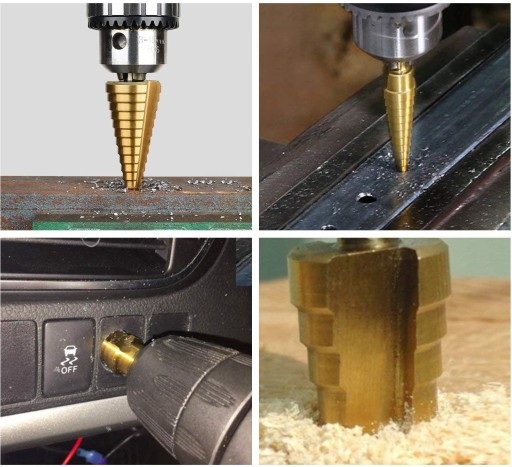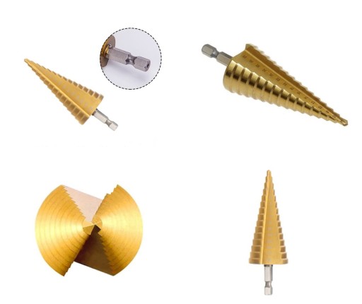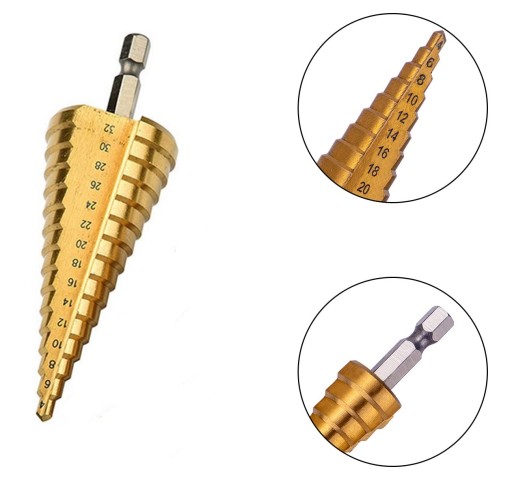 Wiertła stożkowe zostały wykonane z wysokogatunkowej stali szybkotnącej HSS i pokryte powłoką z tytanu. Przeznaczone do blach stalowych cienkościennych, metali, wywiercą cienkie blachy bez uprzedniego nawiercania i zadziorów. Znajdą zastosowanie w ślusarstwie, blacharstwie, branży introligatorskiej itp. Wiertła są pokryte powłoką z tytanu, co kilkukrotnie przedłuża ich żywotność w porównaniu ze zwykłymi wiertłami HSS.