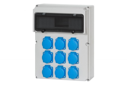 Rozdzielnica typu Femo charakteryzuje się obudową przeznaczoną do zamocowania na ścianie dzięki 6 śrubom,ten model posiada AŻ 9 gniazd jednofazowych 230 V i 13 modułów.