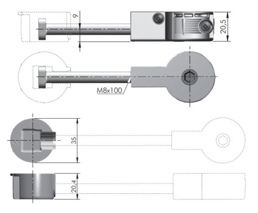 - Składa się z dwóch części: korpus główny z metalowym trzpieniem M8x65 oraz plastikowej, nasadki z otworem na trzpień.