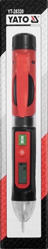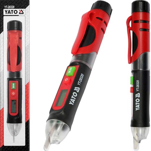 Bezkontaktowy wskaźnik napięcia prądu przemiennego marki YATO, wykrywa obecność napięcia w zaizolowanym przewodzie oraz w niewielkiej odległości od niego. Wykrycie napięcia jest sygnalizowane za pomocą czerwonej diody LED, sygnału dźwiękowego oraz wskazania na wyświetlaczu LCD.