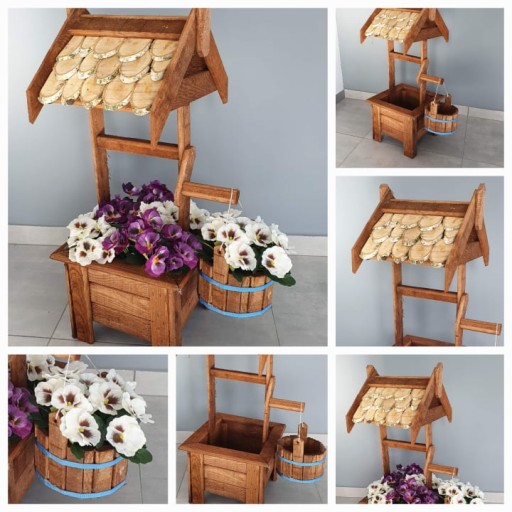 Ozdobna studzienka wykonana z wysokiej jakości drewna sosnowego. Idealnie sprawdzi się jako nietuzinkowa dekoracja przydomowego ogrodu, działki, tarasu czy balkonu lub innych przestrzeni na zewnątrz.