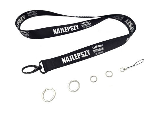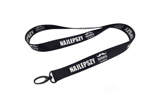 Smycz z nadrukiem najlepszy dziadek na świecie o szerokości 20mm z metalowym czarnym karabińczykiem do kluczy