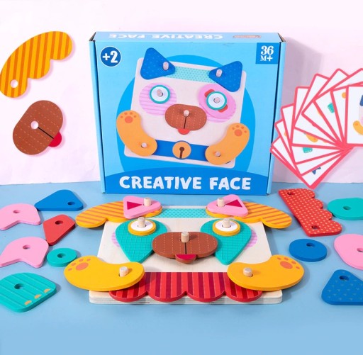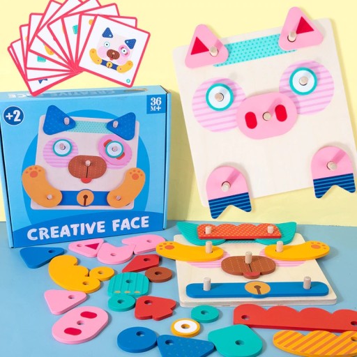 Drewniana układanka manipulacyjna do tworzenia buziek zwierzaków, to idealna pomoc edukacyjna z nurtu Marii Montessori.