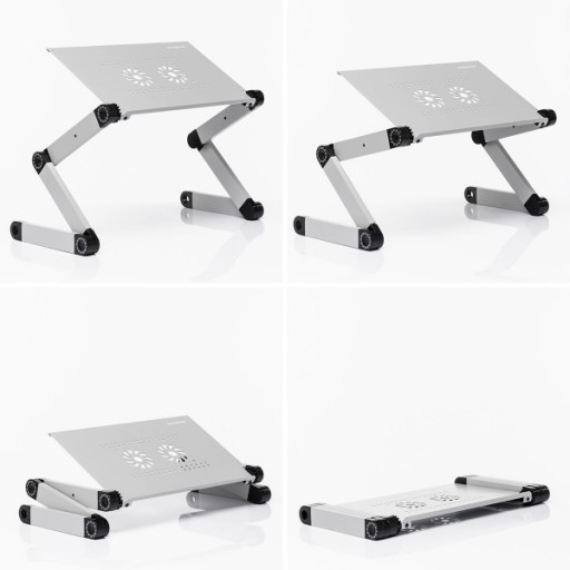 Regulowany wielofunkcyjny stolik, idealny do pracy z laptopem, nadający się również do jedzenia lub służący jako mównica, itp. Dzięki swojej składanej i regulowanej konstrukcji oraz wszechstronności zastosowań, stolik można używać w różnych pozycjach: na siedzeniu lub podłodze, w pozycji leżącej, siedzącej, czy stojącej na stabilnej powierzchni itp. Posiada niezależną podstawkę pod mysz oraz dwie 3-punktowe nóżki przegubowe z możliwością obrotu nawet o 360º, dzięki czemu regulacja wysokości i nachylenia daje nieograniczone możliwości pełnego dostosowania się do potrzeb każdej chwili. Podstawę stolika wykonano z perforowanego aluminium, co sprzyja wentylacji i ogranicza nagrzewanie. Produkt zawiera instrukcję z zalecanymi pozycjami dla najróżniejszych funkcji.
