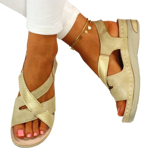 Damskie sandały w kolorze beżowym ze złotymi detalami na niskim koturnie. Idealnie sprawdzą się jako obuwie na co dzień w letnie, upalne dni. Pasek na rzep ułatwia zakładanie obuwia oraz dopasowanie go do stopy. Profilowana, skórzana wkładka zapewnia komfort użytkowania a szyte spody zwiększają wytrzymałość obuwia.