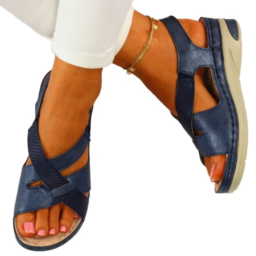 Damskie sandały w kolorze granatowo-srebrnym na niskim koturnie. Idealnie sprawdzą się jako obuwie na co dzień w letnie, upalne dni. Pasek na rzep ułatwia zakładanie obuwia oraz dopasowanie go do stopy. Profilowana, skórzana wkładka zapewnia komfort użytkowania a szyte spody zwiększają wytrzymałość obuwia.