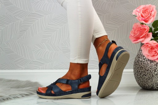 Damskie sandały w kolorze granatowo-srebrnym na niskim koturnie. Idealnie sprawdzą się jako obuwie na co dzień w letnie, upalne dni. Pasek na rzep ułatwia zakładanie obuwia oraz dopasowanie go do stopy. Profilowana, skórzana wkładka zapewnia komfort użytkowania a szyte spody zwiększają wytrzymałość obuwia.