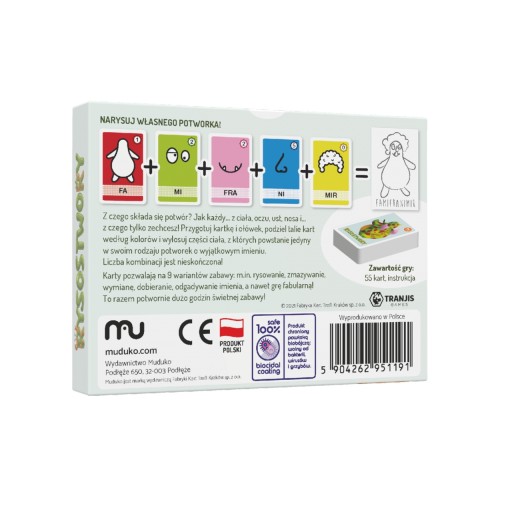 Weź kartkę, ołówek, dobieraj karty, narysuj swojego własnego potworka i nazwij go. Czy dasz radę wymówić jego imię? A może dla odmiany pobawimy się w… zmazywanie potworka? Dobieranie? Albo pomożemy potworkom, które pogubiły swoje części ciała, pozbierać się do kupy? Wariantów zabawy jest aż 9!