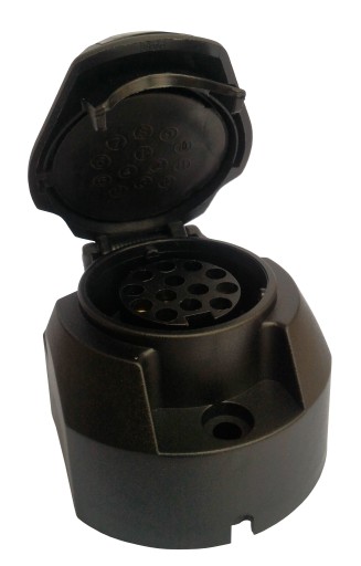 Gniazdo 13PIN z mosiężnymi pinami do haka w samochodzie, niezbędne do użycia światła cofania (przyczepy o DMC powyżej 750kg, lawety, platformy rowerowe) lub do podłączenia przyczepy kempingowej.