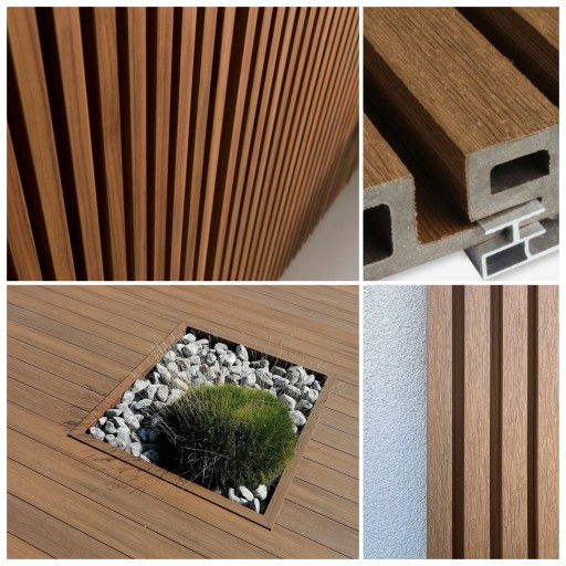 Deski elewacyjne są kompozytem składającym się z mieszanki: 60- 65 % mączki drzewnej oraz 35-40% polietylenu HDPE oraz osłonki polimerowej. Dzięki takim proporcjom zawartości drewna w materiale, deski kompozytowe mają powierzchnię oraz strukturę przypominającą w dotyku naturalne drewno, dlatego swym wyglądem są świetną alternatywą dla tradycyjnego drewna. Polimery wchodzące w skład mieszanki odpowiadają za odporność na warunki atmosferyczne, trwałość oraz kolor, dzięki temu oszczędza się na dodatkowej konserwacji. Materiał bezobsługowy!