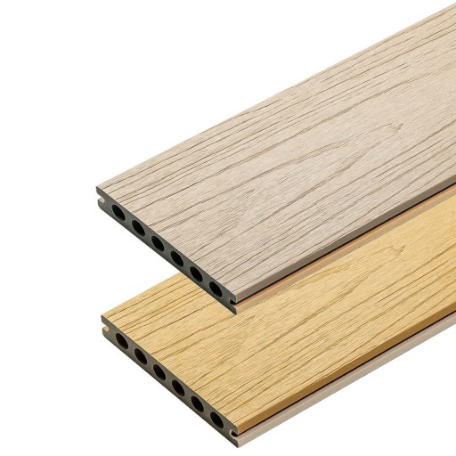 Deska Kompozytowa nowej generacji Premium to produkt wysokiej jakości. Dzięki nowoczesnej technologii produkcji deska ma charakterystyczną strukturę naturalnego usłojenia desek. Deseń drewna jest wytłaczany na powierzchni za pomocą pras w wysokich temperaturach z nałożoną zewnętrzną powłoką polimerową, która otacza deskę ze wszystkich stron i chroni ją przed plamami oraz utratą koloru. Dzięki tej metodzie produkcji jest też trwała i odporna na ścieranie. Druga strona jest w innym kolorze przez co deskę możemy stosować na dwie strony w zależności od preferencji. Dodatkowo konstrukcja wewnętrzna deski jest dużo sztywniejsza i bardziej wytrzymała na uszkodzenia mechaniczne dzięki zastosowaniu specjalnego przekroju okrągłych komór i dużej gęstości kompozytu.