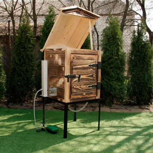 - Wszystkie elementy po zakończonym wędzeniu mieszczą się w drewnianej komorze wędzarniczej. Zapewnia to mobilność wędzarni.