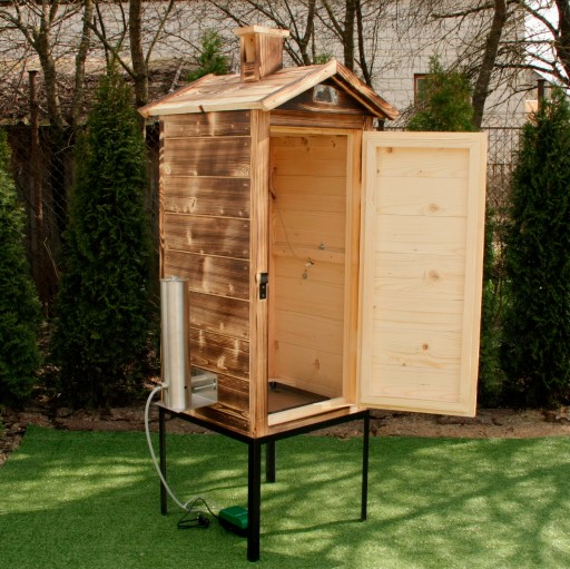 - Wszystkie elementy po zakończonym wędzeniu mieszczą się w drewnianej komorze wędzarniczej. Zapewnia to mobilność wędzarni.
