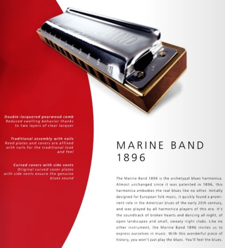 Oryginalna harmonijka bluesowa o legendarnym brzmieniu. Marine Band ze swoim tradycyjnym grzebieniem z drzewa gruszy i unikalnym projektem oprawy jest produkowana już od ponad 100 lat. Pozostaje w dalszym ciągu instrumentem bardzo często wybieranym przez liczne grono najlepszych profesjonalnych muzyków.