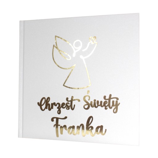 - Dodatkowo na księdze wykonujemy personalizacje tj. naklejamy w kolorze złotym anioła oraz napis Chrzest Święty + imię dziecka