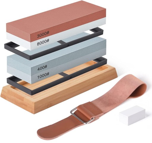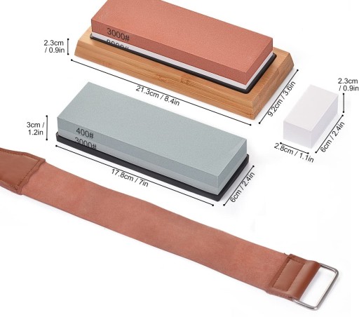 - W zestawie: dwa kamienie z korundu z podkładkami antypoślizgowymi, skórzany pasek, kamień naprawczy, bambusowa podstawka oraz skórzany pasek do gratowania i honowania ostrza