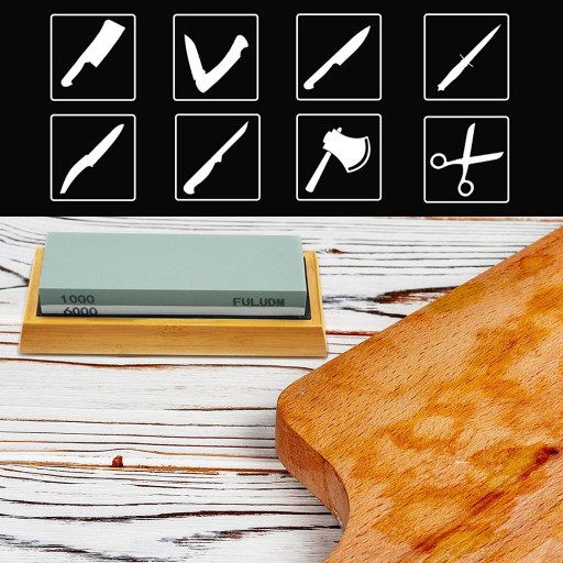 2. Przed rozpoczęciem ostrzenia zalecamy nałożenie rękawic ochronnych, postaw bambusową podstawkę na stole lub płaskiej powierzchni. Zawsze zaczynaj ostrzenie od kamieni o mniejszej ziarnistości (400 → 1000; 3000 → 8000) poczynając od 400 lub 1000 (w zależności od zużycia ostrza). Kamienie o większej ziarnistości służą do polerowania i wygładzania krawędzi nadając ostrzom blask i maksymalną ostrość.