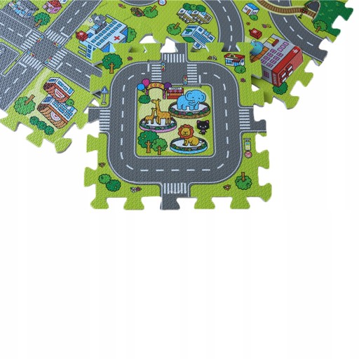 Idealna dla fanów zabawy autkami i innymi pojazdami. Na puzzlach dzieci znajdą: wesołe miasteczko,remizę strażacką, fontanny, posterunek policji, szpital, bank oraz wiele innych ciekawych miejsc. Dzięki wyrazistym kolorom mata będzie pasowała do każdego pomieszczenia, a dzięki braku zapachu twoje dziecko będzie mogło bezpiecznie się bawić.