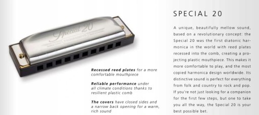 Hohner Special 20 łączy najlepsze cechy drewnianych i plastykowych instrumentów. Polecany zarówno do grania akustycznego jak i do ostrej blues-rockowej muzyki. Świetnie brzmi i daje duży komfort grania zarówno w najniższych jak i najwyższych tonacjach.